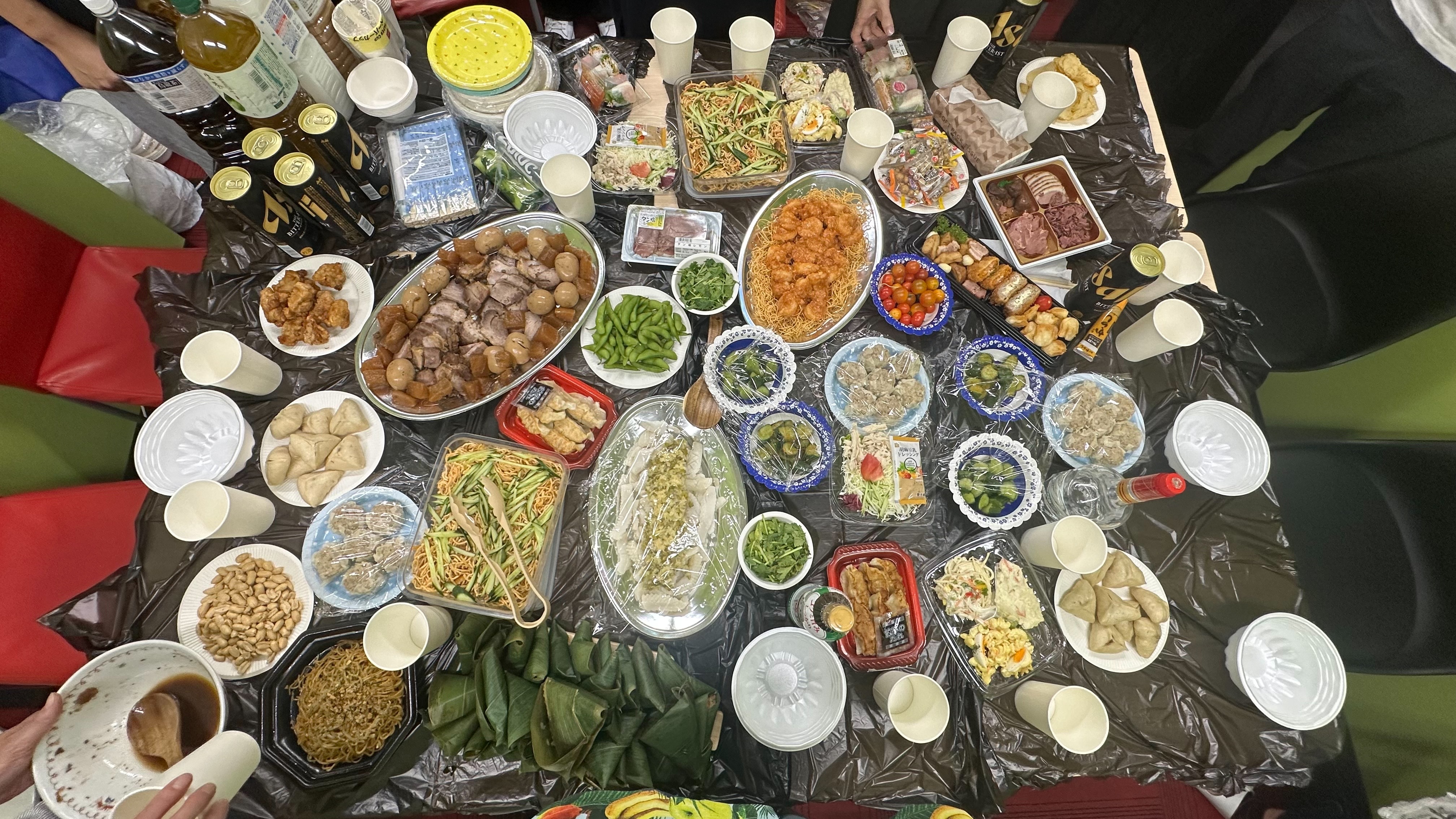 料理: 季節野菜サラダ、エビチリ・豚の角煮、餃子、粽、 ロストビーフ、チャーハン、杏仁豆腐、西瓜など