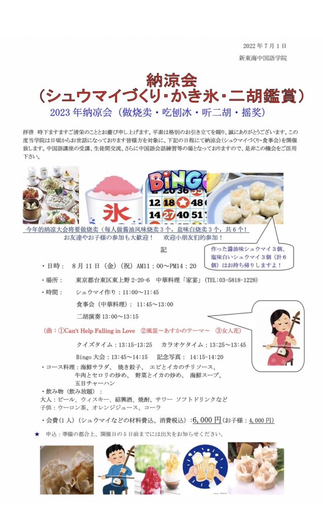 2023年納涼会(シュウマイ作り・二胡鑑賞)開催