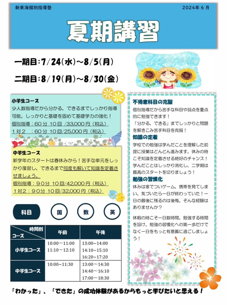 2024年夏期講習 期間:7月24日(水)ー8月5日(月),8月19日(月)ー8月30日(金)